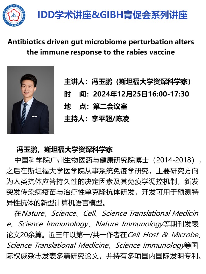 2024年12月25日IDD學術(shù)講座&GIBH青促會系列講座:Antibiotics driven gut microbiome perturbation alters the immune response to the rabies vaccine