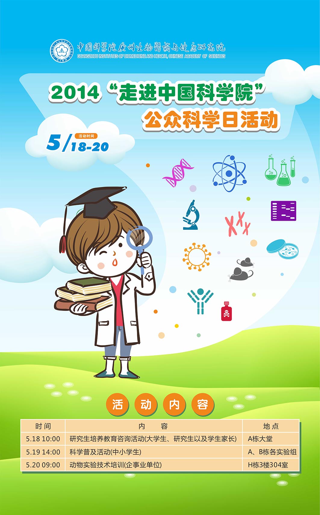 中科院廣州生物醫(yī)藥與健康研究院定于5月18-20日開展2014“走進中國科學(xué)院”公眾科學(xué)日活動,介紹宣傳生物院的研究成果及平臺支撐能力,宣傳生物院近年來的教育成效,吸引優(yōu)秀生源,提升生源質(zhì)量;參觀、講解結(jié)合普及科學(xué)常識,輔以給學(xué)生動手參與和實際觀看實驗過程,激發(fā)青少年對科學(xué)的興趣,樹立良好的科技創(chuàng)新理念。具體活動安排如下: