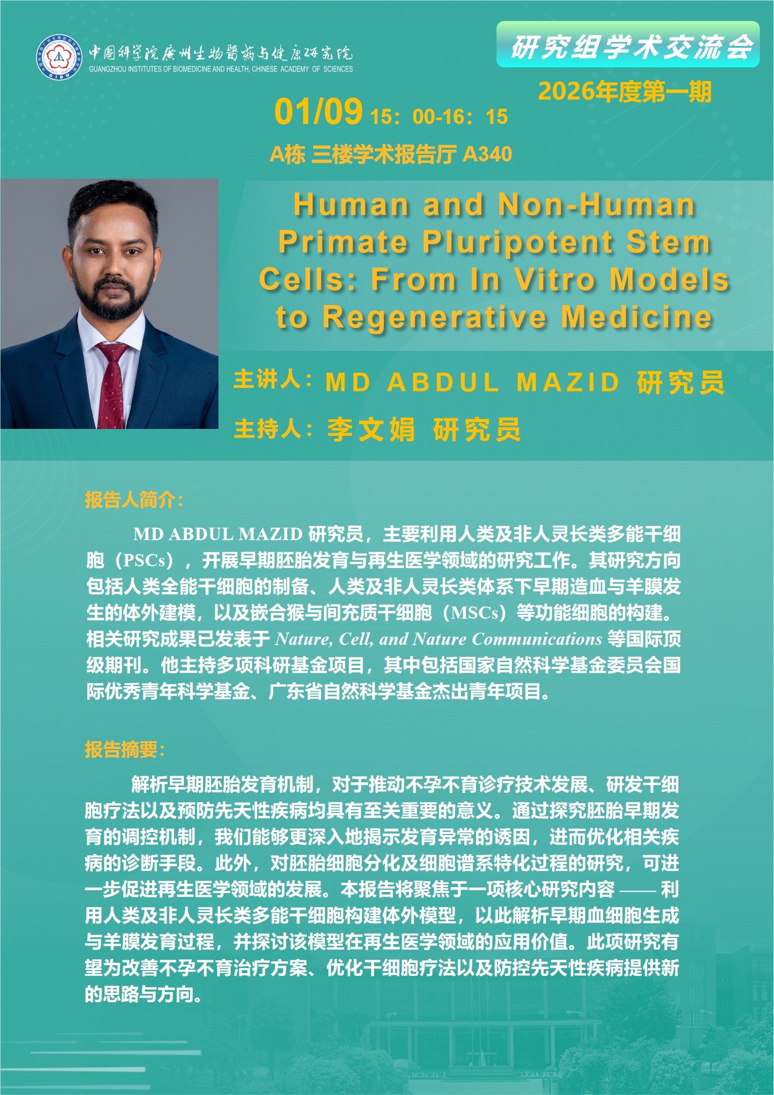 2026年1月9日研究組學術交流會(2026年度第一期):Human and Non-Human Primate Pluripotent Ste Cells: From In Vitro Models to Regenerative Medicine